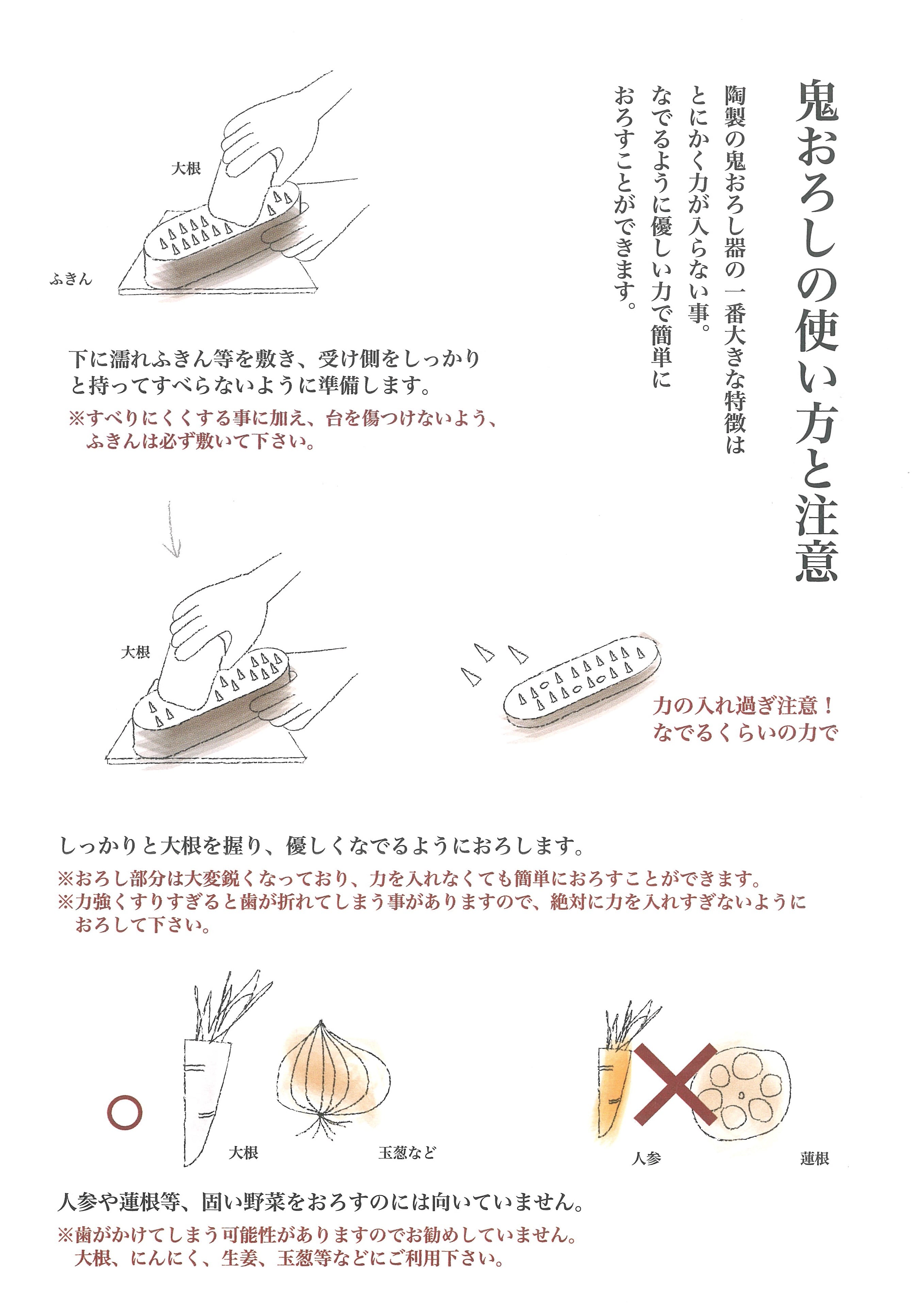 大根・山芋・しょうが等をそのままテーブルへ。かなり鋭角におろし部分を成型しており、そんなに力を必要とせずにおろすことが出来ます。上フタのおろし部分は水洗いで簡単にきれいになります。電子レンジ・オーブン・食洗機OKです。